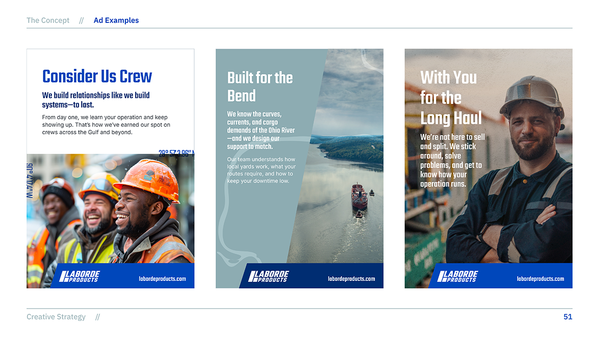 We developed a creative strategy deck that defined the campaign voice, visual direction, audience segmentation, and channel strategy. From that foundation, we designed a full suite of digital ads, social content, and landing page concepts. Each piece was built to be testable: modular headlines, interchangeable imagery, and variant CTAs designed for performance optimization.