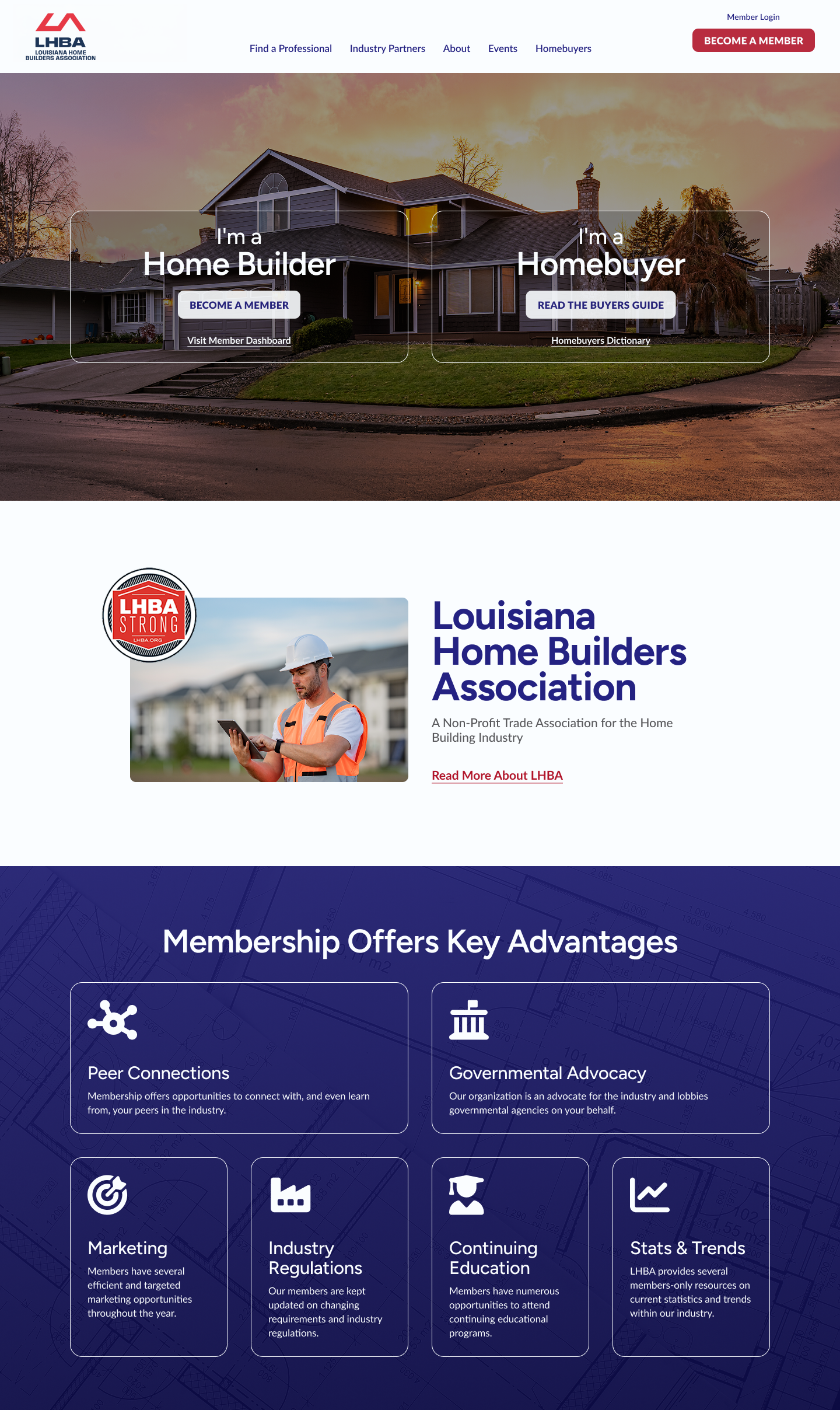 The site features member testimonials, a news hub, event promotion, and quick-access tools for finding local associations and industry professionals. Every page reinforces the brand's positioning as the connective tissue of Louisiana's home building industry: organized, resourceful, and actively working on behalf of its members.